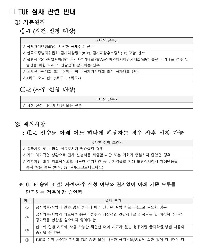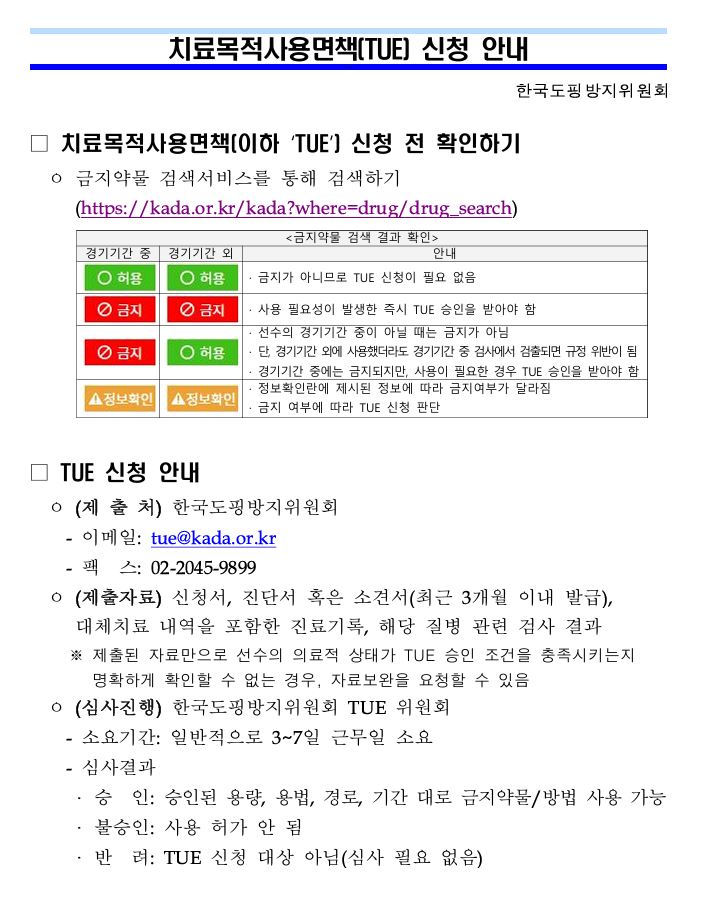 제106회 전국체육대회 도핑관리/치료목적사용면책(TUE) 신청 안내