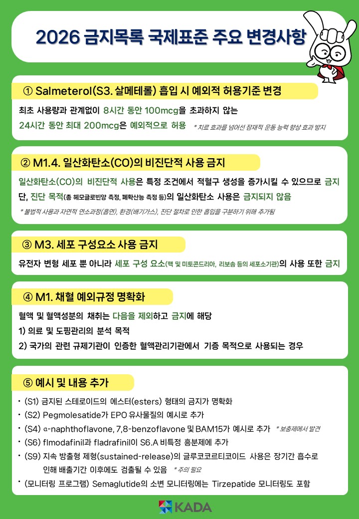 세계도핑방지규약 2026년도 금지목록 국제표준 주요 변경사항 안내