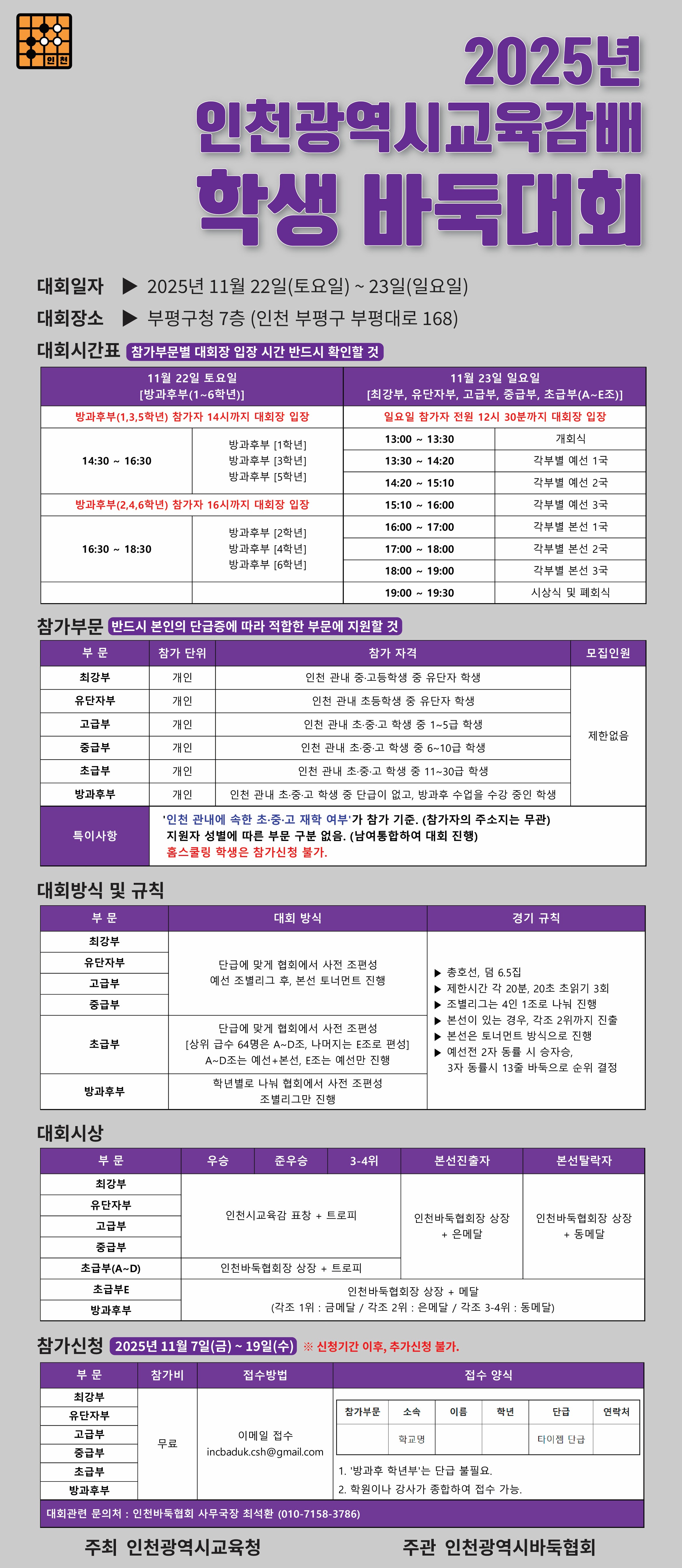 2025년 인천광역시교육감배 학생 바둑대회(11/22~23)