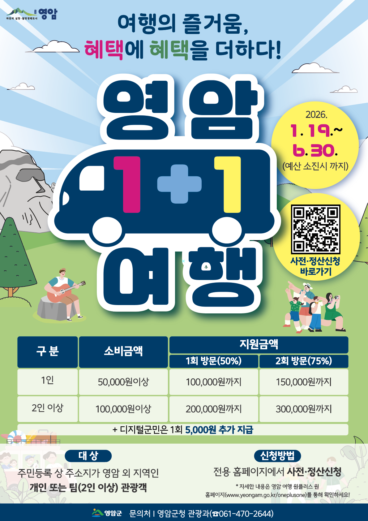 ② (포스터 참조) 사전 신청을 통해 영암 관내 여행 비용 영암사랑상품권으로 지원하오니 많은 관심과 참여바랍니다.